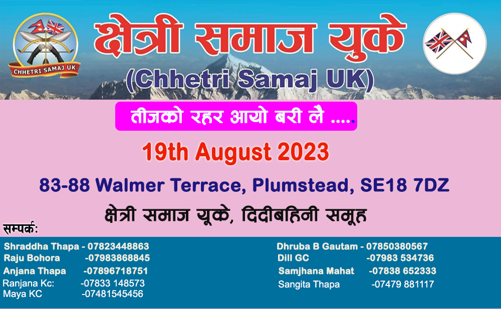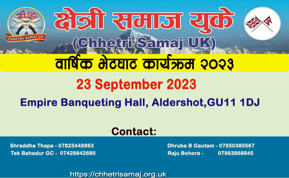 Starting as a humble initiative in 2007 by some of the retired Chhetri Army personnel of Gurkha has now significantly expanded to become one of the competent and respected social organization in the UK. Working with the Chhetri communities in the UK with the coverage in most parts of the country where the targeted communities are settled, it implements its support initiatives at need, cohesive lively hood and advocates for the promotion of its cultural heritage both to the upcoming generation of Chhetri and wider arena of social composition.